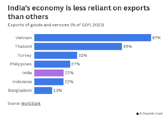 根据世界银行的数据,2023 年,商品出口(以及不受关税限制的服务出口)约占印度经济的五分之一。与此同时,泰国和越南等新兴市场竞争对手的出口分别占其国内生产总值的 65% 和 87%。