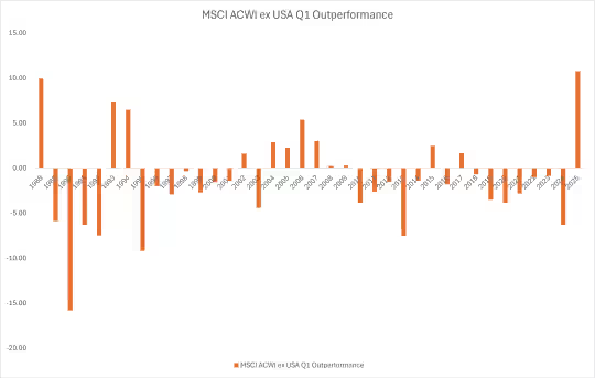 但进入新年的头三个月后,形势已大不相同——受热门AI交易平仓和关税相关不确定性的影响,美国股市在2025年第一季度举步维艰。而与此同时,其国际竞争对手则一路高歌猛进。